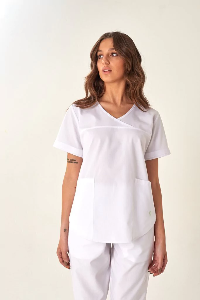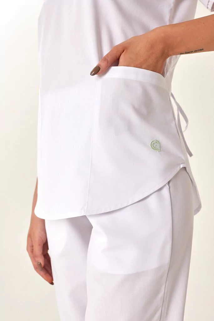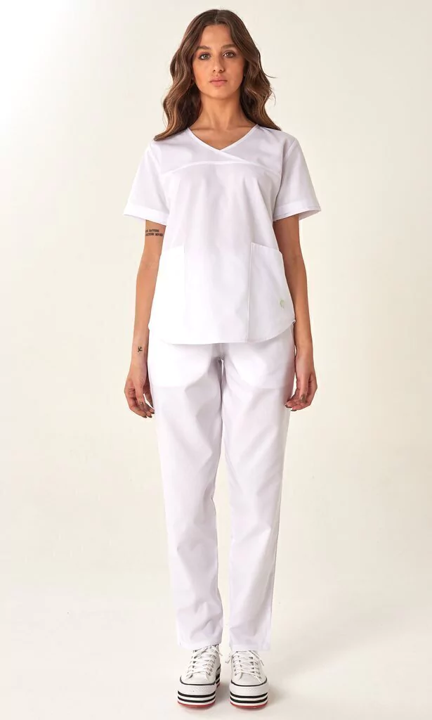 Descripción: Chaqueta escote V cruzado, doble bolsillo al frente y tira de ajuste en la cintura trasera. Pantalón con cintura elástica, doble bolsillo a los laterales y un bolsillo trasero.