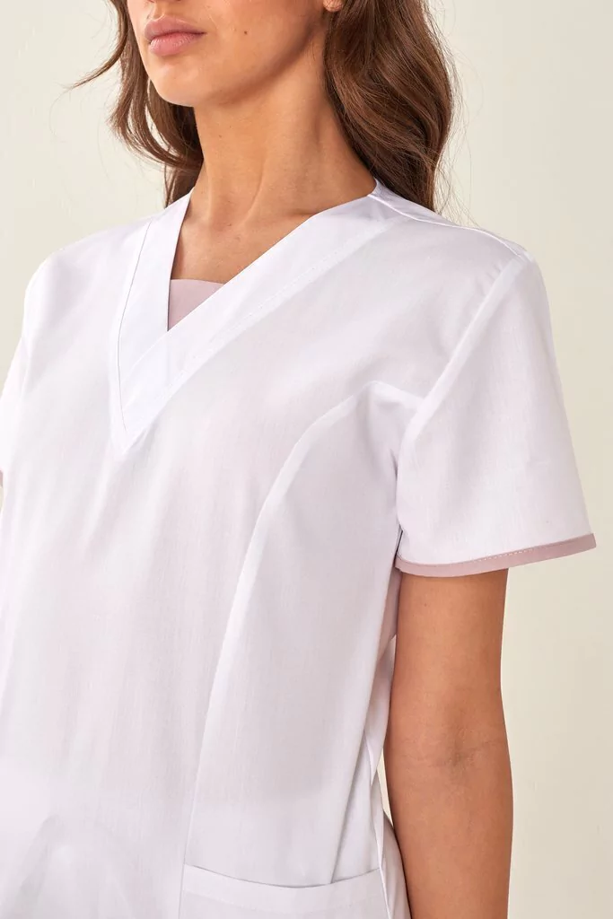 Descripción: Chaqueta escote V con detalles en color rosa pálido, doble bolsillo al frente, tira de ajuste en cintura trasera. Pantalón con cintura elástico y tira de ajuste, doble bolsillo a los laterales con cierre invisible, botamanga con detalle abierto.